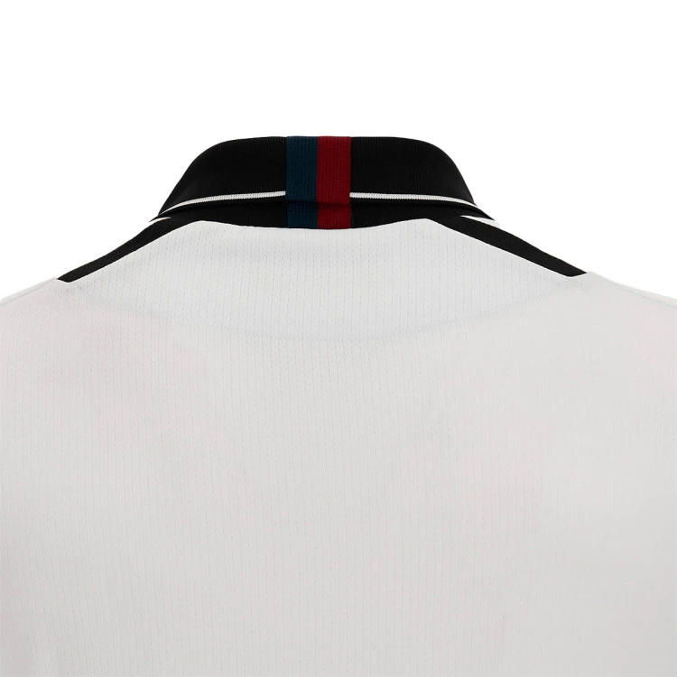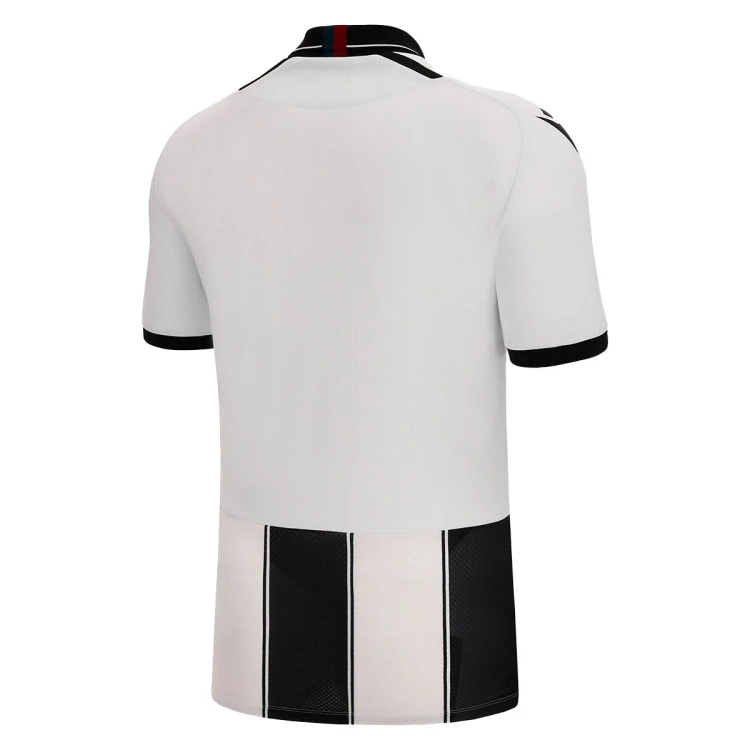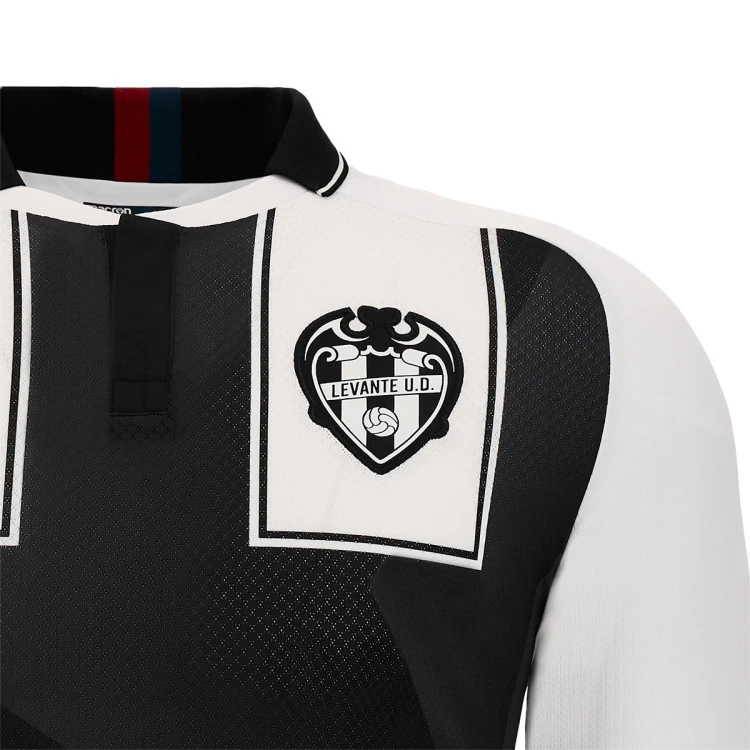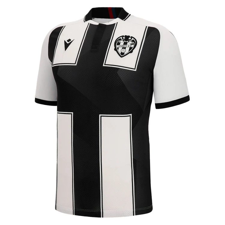 La camiseta de la segunda equipación del Levante para 2022/23 propone una bonita innovación estilística, con las rayas aplicadas por sublimación directamente en el jacquard. Las rayas verticales en blanco y negro presentan en su interior un motivo degradado en bajo poligonaje. El cuello aporta un toque de estilo adicional, pues presenta en su interior una cinta de tejido personalizada con los colores del club. En su conjunto, el estilo de la camiseta es elegante, ideal para sorprender y distinguirse en el campo del adversario.